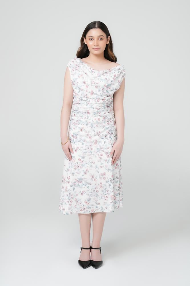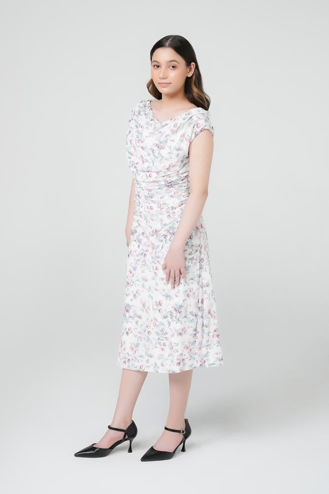 فستان بقماش مورد، يتميز بكتف مكشوف وكم منسدل ليعطي أنوثة وانسيابية. ويأتي بزم جانبي يبرز الخصر ويمنح اطلالة متوازنة.
